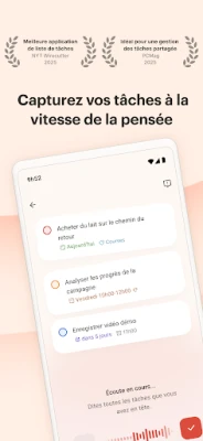 Votre esprit est une source d'innovation, non un simple coffre-fort à informations. Todoist vous permet de capturer chaque inspiration dès qu'elle surgit. Grâce à l'ajout vocal, dictez simplement votre tâche et l'application l'organise intelligemment dans le projet et avec l'échéance appropriés. L'ajout rapide, quant à lui, interprète vos phrases naturelles – comme "Envoyer le rapport tous les vendredis à 16h #ProjetAlpha" – pour créer des entrées structurées en un instant, assurant que rien ne vous échappe et que chaque idée trouve sa place.