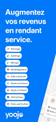Débloquez un monde d'opportunités de services à proximité et transformez votre temps disponible en revenus substantiels avec Yoojo. Conçue pour les prestataires exigeants, cette plateforme vous offre la flexibilité de prendre en charge des missions quand vous le souhaitez, directement depuis votre téléphone. Libérez votre potentiel de gains, structurez votre emploi du temps et gérez votre activité de manière intuitive et efficace, le tout sans aucun frais d'inscription ni publicité intrusive.